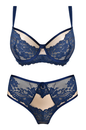Dámská push-up podprsenka, jejíž košíčky jsou vyrobené z béžové pěny. Spodní část košíčků pokrývá tmavě modrá krajka. Vrchní část košíčků je olemovaná tmavě modrou páskou. Model má vyjímatelné push-up vycpávky. Krajkové boky jsou zpevněné bočními kosticemi. Ramínka je možné nastavit, ale nelze je odepnout...
